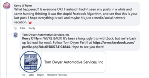 This months’ Comment was made well over a year ago.  It came in the form of a Comment on what turned out to be our  last post for Tom Dwyer Automotive Services on Facebook.  Kerry O. asked…
