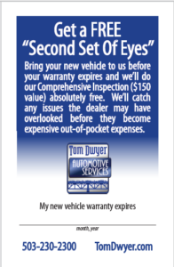 In a strange way it’s nice when our clients buy a new vehicle and deal with the Dealer for a while. They get a great chance to compare Tom Dwyer to another service, and we’re very confident we look good in the comparison! But those Dealer ‘freebies’ aren’t for you, they’re designed to get you used to using the Dealer so you stay with them when the warranty period is up. They often work. Of course we want those folks back, so we came up with a way to entice you back to us by giving you the most value from your Dealer experience. If you bought (or are planning on buying) a new vehicle that comes with free Dealer service, PLEASE TELL YOUR SERVICE ADVISOR and they’ll give you a card for a FREE 2nd Set of Eyes. Dealers aren’t usually allowed to mention problems they see that could be covered under warranty; you have to bring them up yourself to get coverage. Put the card on your refrigerator and forget about it for now, but bring your new vehicle to us BEFORE YOUR WARRANTY EXPIRES. We’ll do our complete Comprehensive Inspection for free to catch any issues the Dealer may have ‘missed’, and you can take the vehicle back for repairs BEFORE your warranty expires. And then when the warranty is over, you can come back to the Dwyer Service you know and love. Don’t pass up this offer… it can save you thousands of dollars!